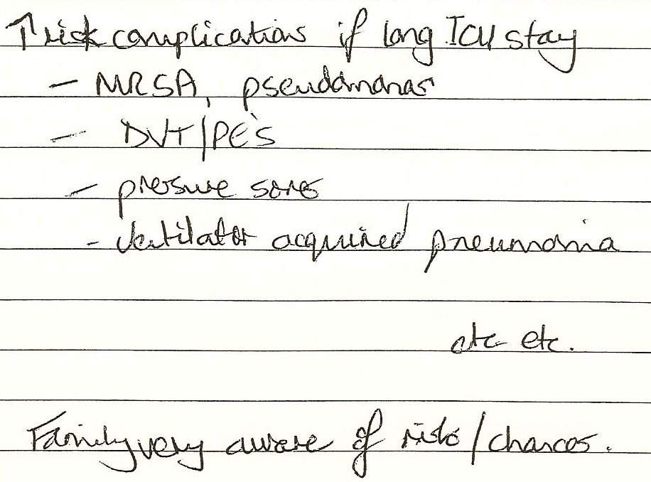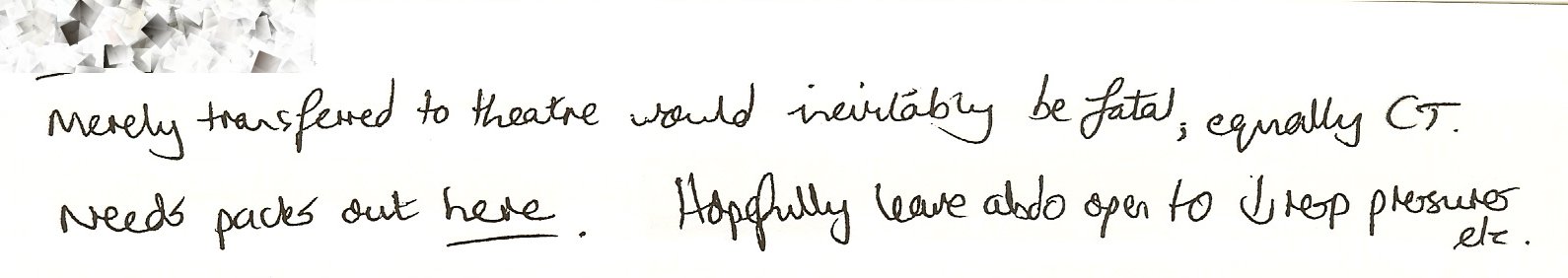 “5.15am – Discussed with husband and family. Major setback. Good reduction of fracture but no guarantee that this will stop the bleeding. Given her lots of blood products which means she has an increased risk of lung failure. The pelvic fracture alone now carries a 50% survival rate. No questions asked [by relatives]“