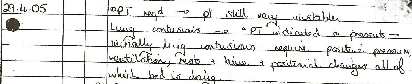 “5.00am – Returned from theatre. X Fix in place. Good reduction on screening. Increased airway pressures in theatre. OK now, Needs blood and platelets”