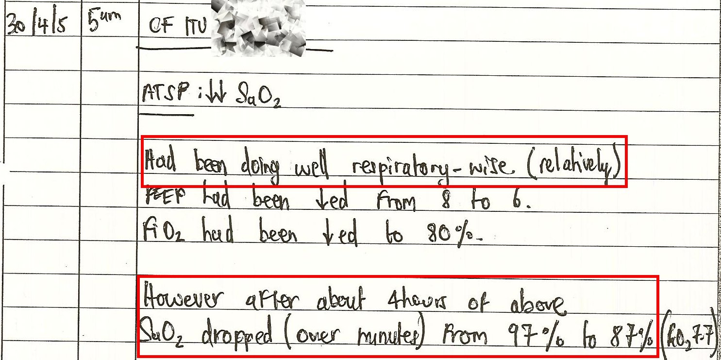 “5am – Had been doing well respiratory-wise (relatively). However after 4 hours of above Sats dropped (over minutes) from 97% to 87%”