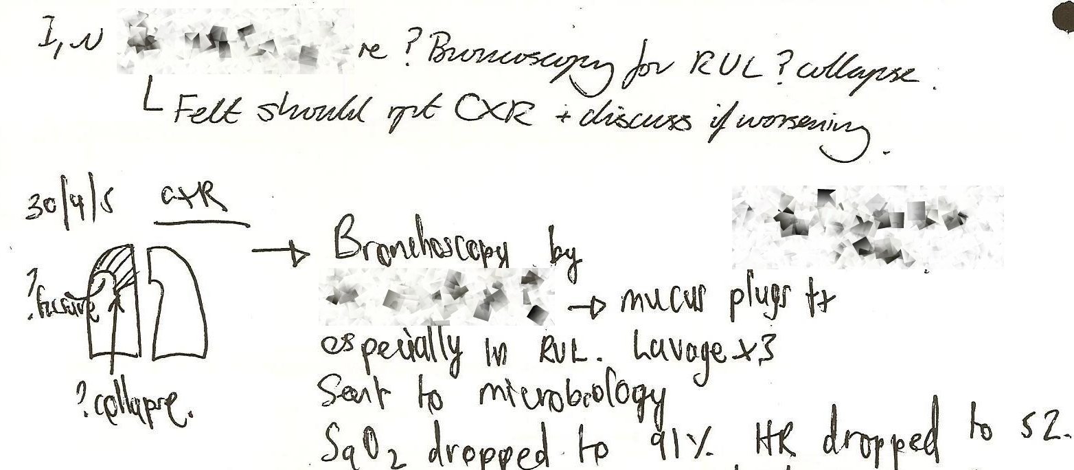 “Sats to 83% despite 100% O2, Few Harsh Sounds bronchial breathing right upper lung, suggested bronchoscopy for right upper lung collapse, felt should repeat central x-ray and discuss if worsening”
