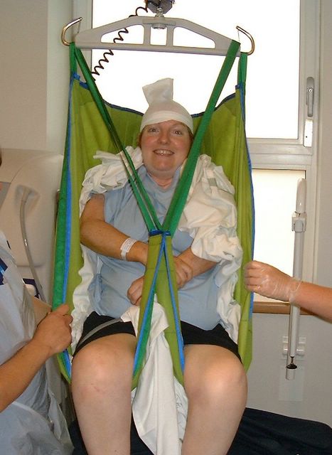 First, they shifted her to a physio bench with a PAT slide. Then one physio gradually lifted her back, while the other 2 held her hips and legs in place. A huge smile came across her face as she started to be sat up and she came out with:-