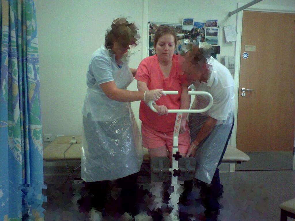 Physio consisted of lots of muscle strengthening exercises and then the finale was a stand, but a stand with a difference. This time, the physio did virtually nothing. It looked like he just made sure that she didn’t fall over during the maneuver. So, kp had to do all the stand herself. It REALLY was a LOT LOT harder than previous stands, and I would say she got to about 80% of the stand position, but no matter how hard she gripped her teeth, the legs wouldn’t lengthen that extra bit.