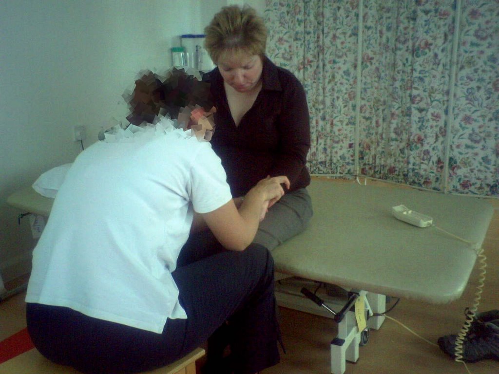 With the arm exercises over, the physio finished off looking at kp’s wrist movement which she noticed was restricted. If you have your hand face down on your lap and then turn it over as far as you can, then this is the kind of movement the physio worked on. kp has no problem with her hand face down, but she has restricted movement turning it upward.