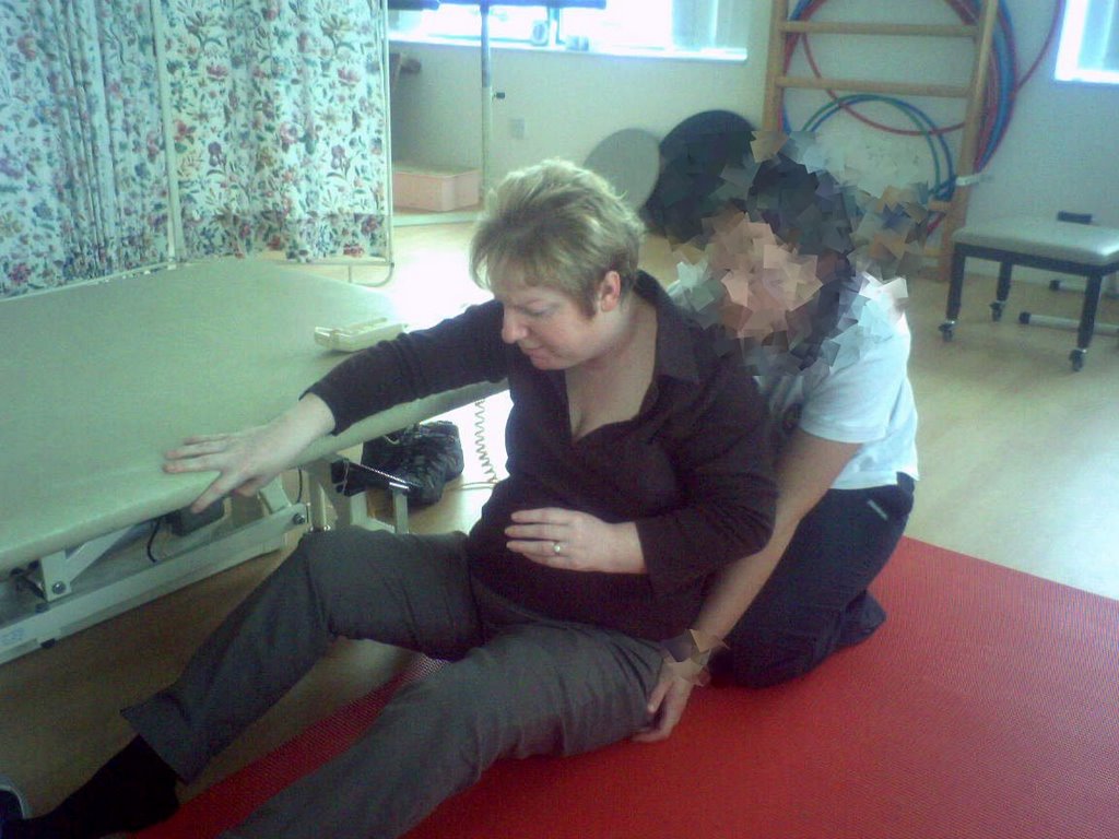 So, with the aim of getting kp lying (as if from a fall), she first had to get to being on all fours. kp started off sitting on the physio’s bench, which she lowered as low as possible. kp then had to get on to her knees which she did with the physio supporting her – there were LOTS of “ow”s. I would have aborted the maneuvre at the first “ow”, but she (physio) persisted. Once on her knees, she had to get on to all fours as if she was crawling.