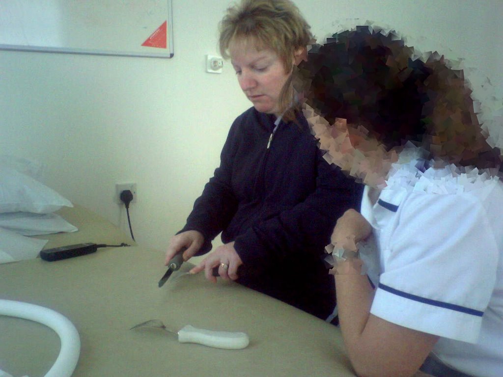 He was a nice bloke and he asked kp lots about the accident and how it has affected her life. He finished with an examination where we had a funny incident. To set the scene, kp has a very large scar on her stomach. It is about 1 inch wide and because of her hernia is very long going from just below her chest to the very bottom of her stomach (about 16 inches). It has the usual cross-pattern where the stitches were, so is quite a sight at first viewing. So, back to the examination…..