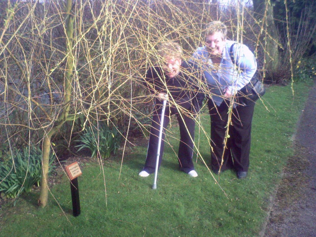 I asked the ladies to pose in front of it for the blog, but I couldn’t seem to get them in, so kp suggested they bend down. Well, it got them in the frame, but I can’t say it makes the best picture in the world, what with Lee’s branches masking their faces.