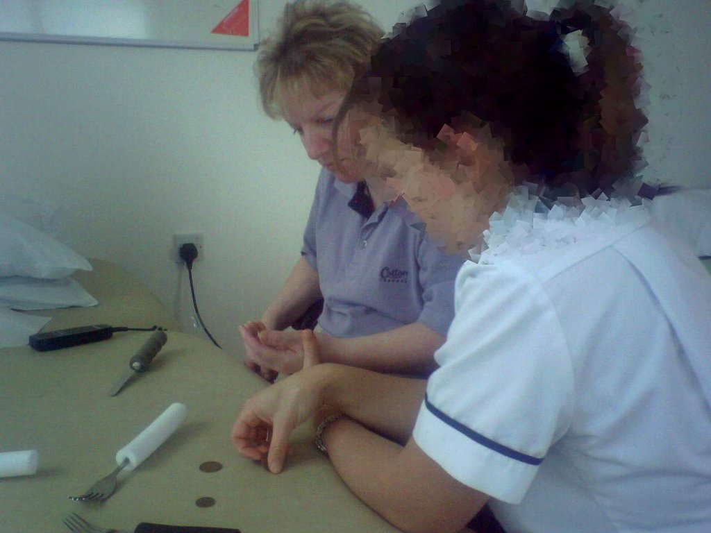 The physio consulted kp’s notes and knew that this week she wanted to concentrate on trying to use a fork again (with her left hand). She only uses a fork in her right hand at the moment (and I cut up her food).