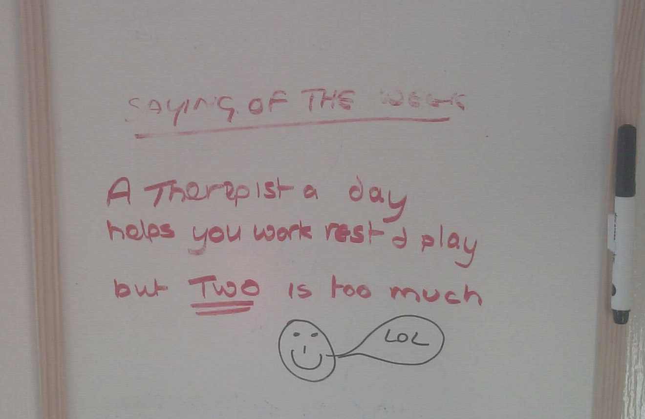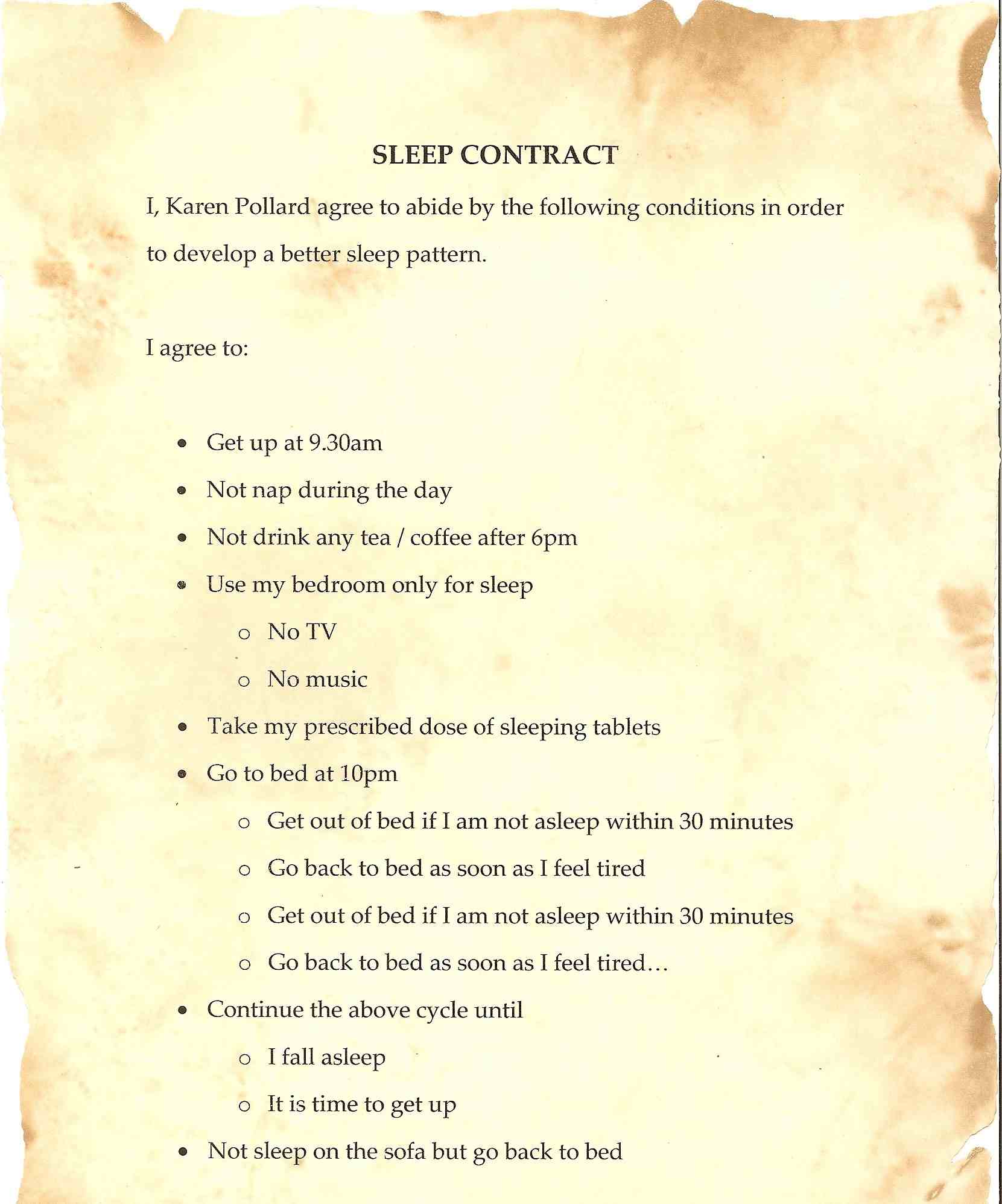 Tuesday was a busy day, Steve (the physio) came and left kp with some new exercises. Rachel (the OT) came and did some relaxation exercises with Karen that she can use to help her to sleep. She also brought with her a “Sleep Contract” which she had done a great job with, on some very old looking paper. Here it is. kp had to sign it, but I have purposefully left off the signature part…..