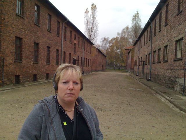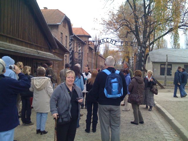 On Friday, we came to Poland for a few days. It was karen’s birthday present from me. She had always wanted to go to see the Auschwitz Concentration Camp. The hotel is lovely (radisson sas) and yesterday (saturday) we made the trip to Auschwitz and Birkenau. It was an unforgettable trip and quite moving. At the bottom of this post should be some photos. Not sure what order they will be in, but one is of Karen under the infamous “Arbeit macht frei” sign, one is of me that I took myself ‘cos Karen wasn’t there (more about that shortly) and one is of Karen next to the buildings where they housed 700-1000 prisoners in EACH building). I had told her not to smile so much but I think she took it to the extreme in that shot.