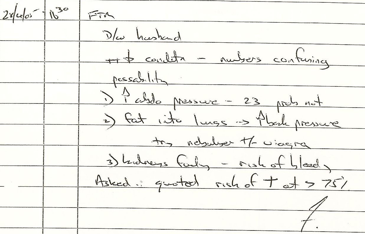 “5.15am – Discussed with husband and family. Major setback. Good reduction of fracture but no guarantee that this will stop the bleeding. Given her lots of blood products which means she has an increased risk of lung failure. The pelvic fracture alone now carries a 50% survival rate. No questions asked [by relatives]“