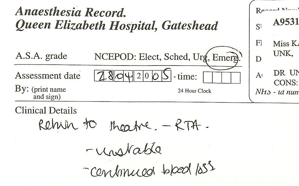 “4.30am – Was given 10 Units of Blood and 7 Units of Colloid/Crystalloid”