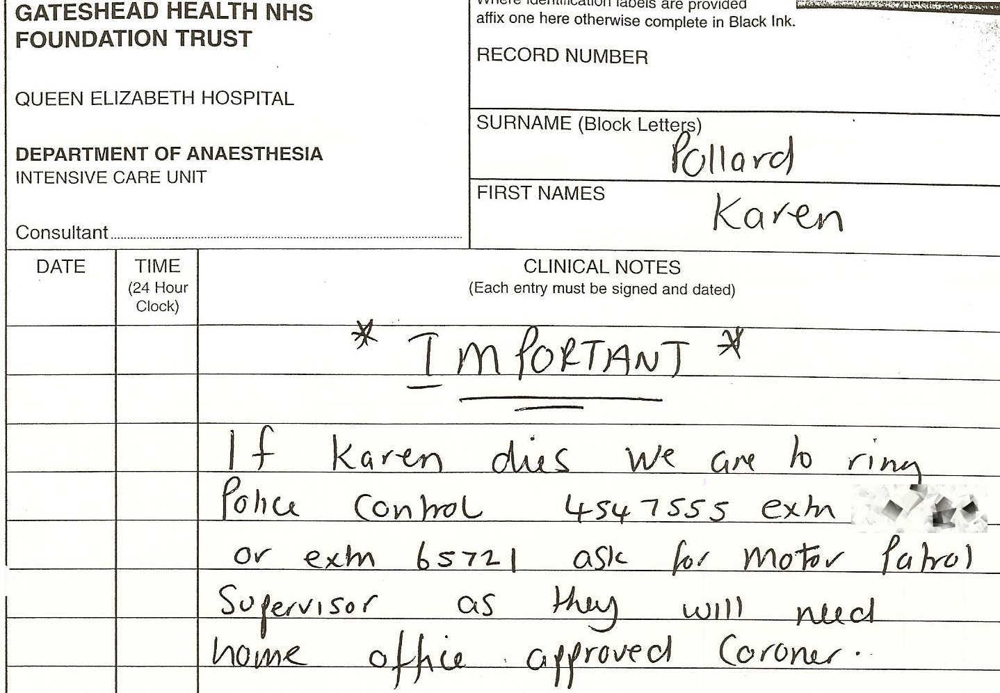 “Husband and family spoken to by Frank and myself several times overnight to update them on her condition. They are fully aware of her injuries and that they are ON THEIR OWN life threatening. However this does not seemed to have been absorbed so we continue to reinforce that there is a real possibility of death”