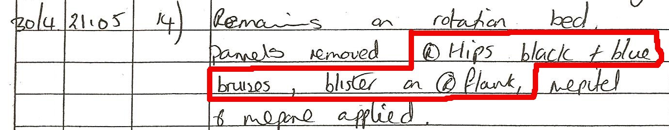“9.05pm – Remains on pressure bed. Right hips black and blue bruises, blister on right flank”