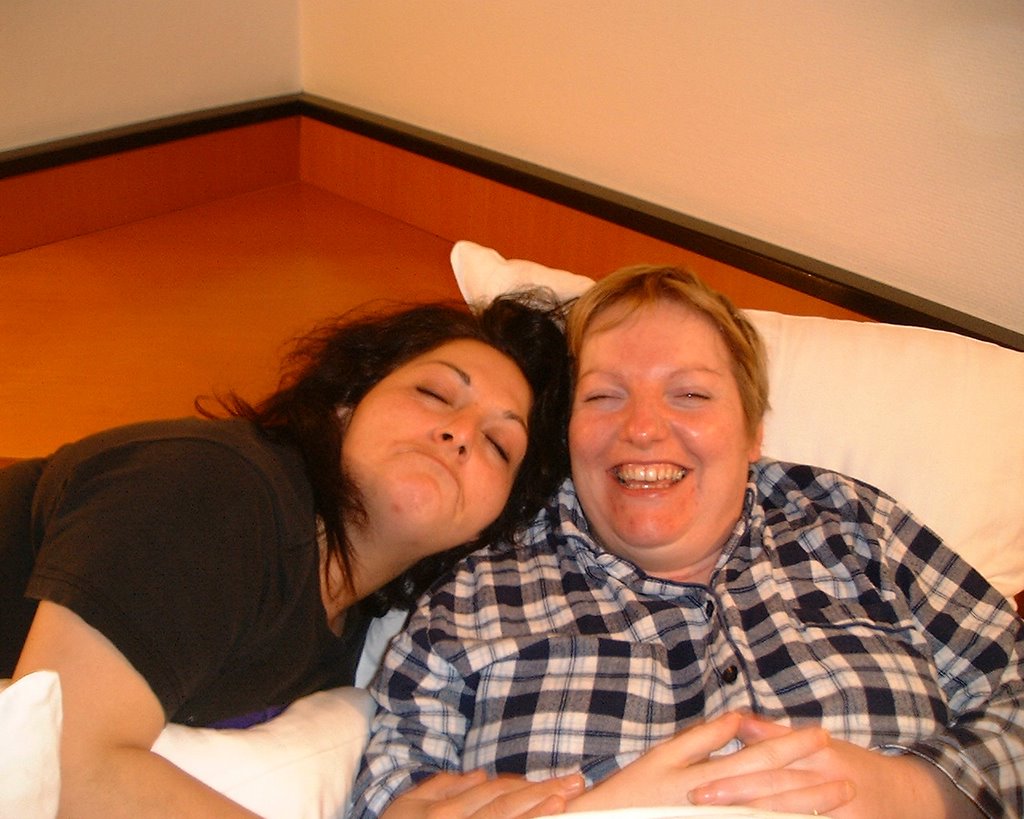 It wasn’t the same without kp, but we made the best of it, and Freddy had a doggy bag prepared for kp. When we got back, kp was feeling much better and she invited Michelle and Freddy to the room. She devoured Freddy’s doggy bag………And then Michelle and Karen pretended to be asleep for the camera……..