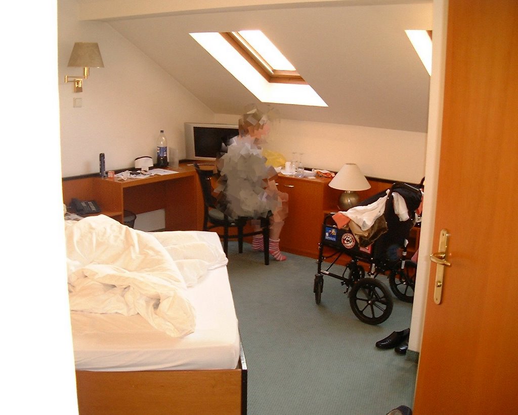 Prague is NOT designed for wheelchairs. Finding a pavement with tarmac is a rarity. More often we were faced with mosaic-like pavements with mosaic pieces missing. These made for a very bumpy ride for kp and a very concentrated drive for me. It only takes one of the mosaic pieces to be missing for kp’s wheelchair to stop in its tracks and for kp to move quickly towards the pavement heads first. Thankfully, she only “nearly fell out” once, although there were a number of emergency stops. The worst ones were in the middle of the roads (with cars hurtling towards you), when a wheelchair wheel would get stuck in a tram rail track