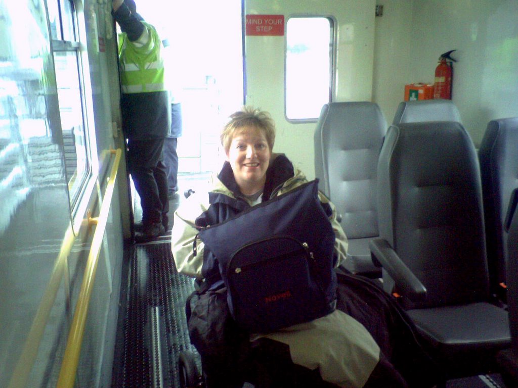 We were intercepted en route by name and ushered towards the Batmobile, well, the ambulift (but batmobile sounds better). . They must have been only expecting one wheelchair passenger at that time but it was still nice to not have to announce yourselves to someone. They took us to Gate 7 where we boarded the batmobile. It’s like a hollowed out catering supply van which goes up and down. We boarded, it went down. Someone drove us to the airplane where we boarded the starboard door. Here is kp in the batmobile……..