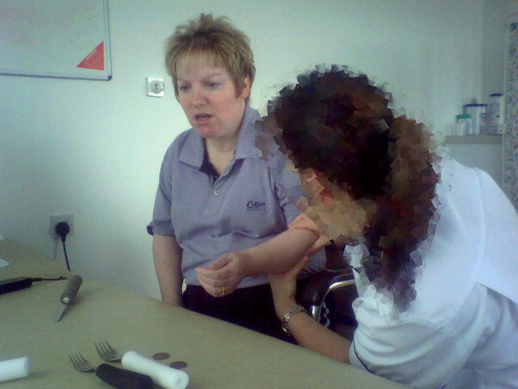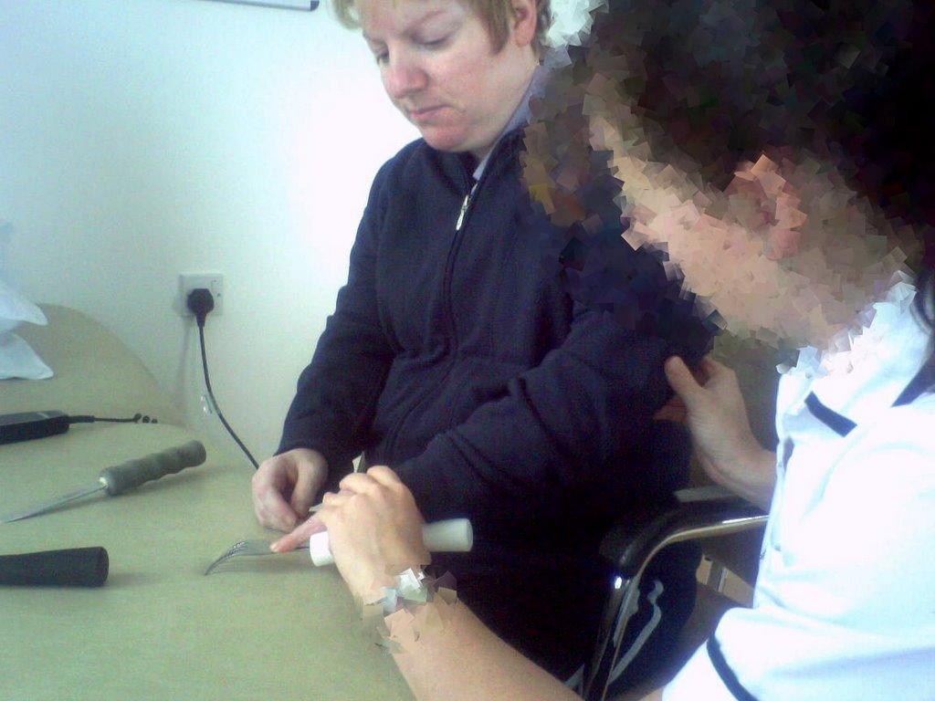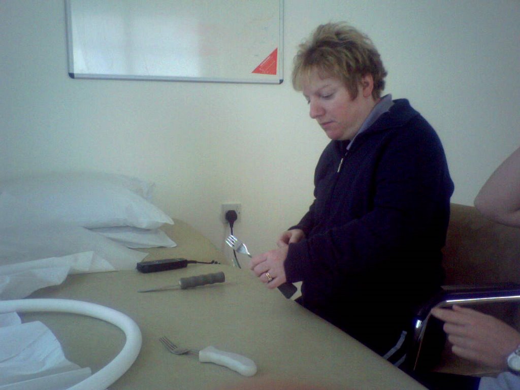 The physio consulted kp’s notes and knew that this week she wanted to concentrate on trying to use a fork again (with her left hand). She only uses a fork in her right hand at the moment (and I cut up her food).