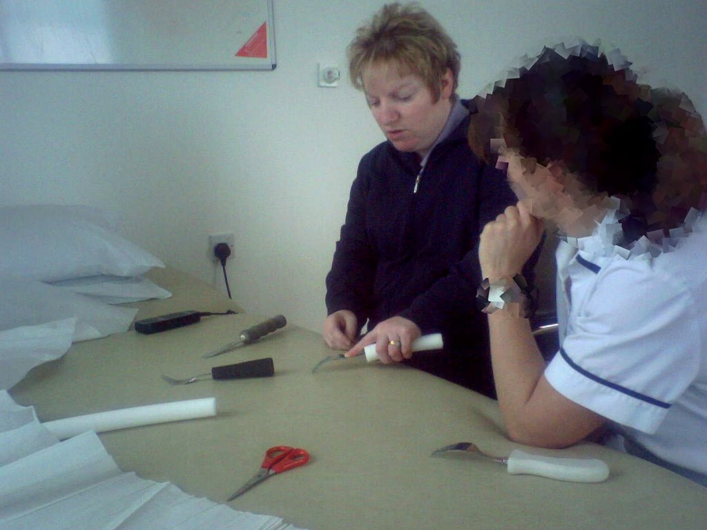 The physio went to get some adapted forks which basically have big grips, which are more easy for kp to hold.